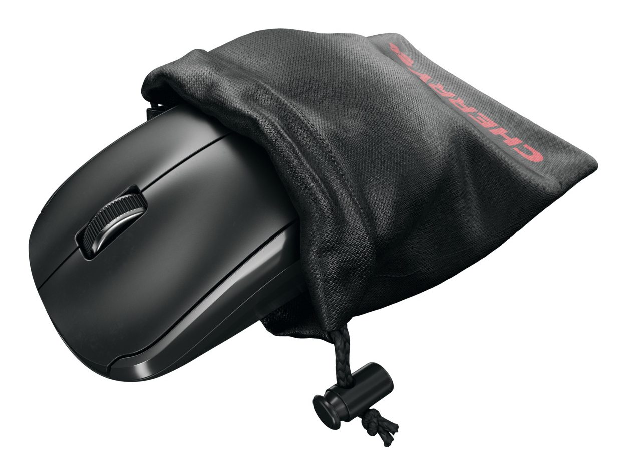 Kompakte Laptop-Maus mit Nano-USB-Empfänger und Transporttasche.