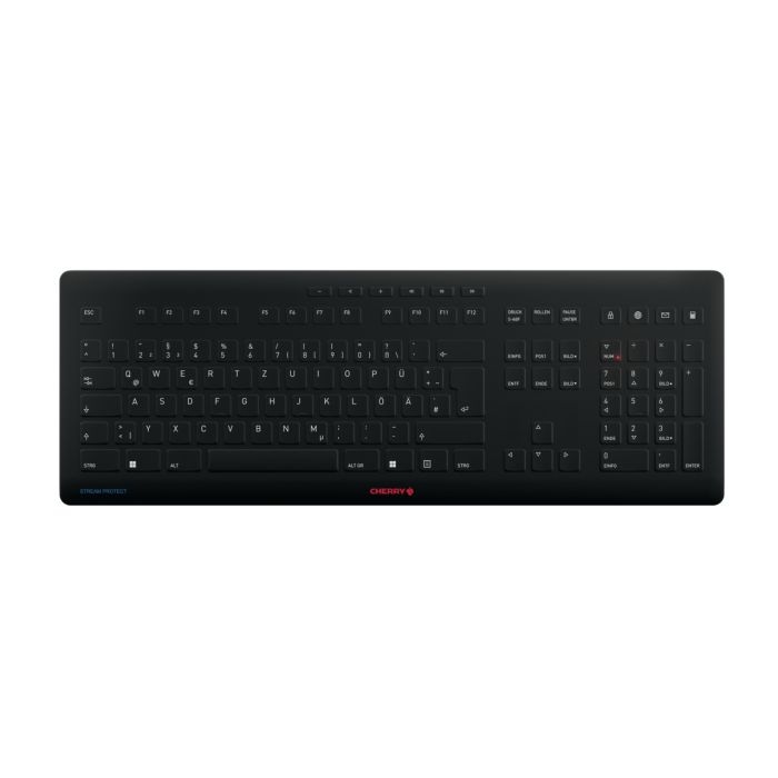 Die STREAM PROTECT MEMBRANE bietet hygienischen Schutz überall dort, wo bereits eine CHERRY STREAM Tastatur eingesetzt wird, z.B. in der öffentlichen Verwaltung, in Bildungseinrichtungen, Schulen und Universitäten oder in gemeinsamen Büroumgebungen / Shared Offices. Das CHERRY STREAM KEYBOARD WIRELESS wird mit der CHERRY STREAM PROTECT MEMBRANE zum CHERRY STREAM PROTECT KEYBOARD WIRELESS. Das Tastenfeld wird vollständig geschützt, kann durch Wischen einfach gereinigt und sogar desinfiziert werden, ohne auf den gewohnten Schreibkomfort zu verzichten. Zum Wechseln und zum Waschen wird die Tastenmembran auf der Tastatur getauscht. So schützt die STREAM PROTECT MEMBRANE wirkungsvoll Mensch, Tastatur und Natur. Unverändert zuverlässig und unkompliziert ist die 2,4 GHz Funkverbindung der STREAM WIRELESS Tastatur mit bis zu 10 Metern Reichweite. Sie lässt sich Plug & Play über den Empfänger mit dem PC verbinden. Die Funkverbindung verfügt über eine AES-128 Datenverschlüsselung. Geringer Batteriestand wird über die in den Tasten eingebauten Status-LEDs angezeigt.
