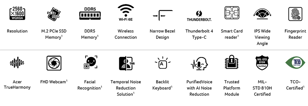Lassen Sie sich von den visuellen Details auf dem WQXGA-Display (2560 x 1600)1 mit schmalem Rahmen und einem Seitenverhältnis von 16:10 fesseln. Tauchen Sie ein mit Acer TrueHarmony für ein unvergleichliches visuelles und akustisches Erlebnis.
