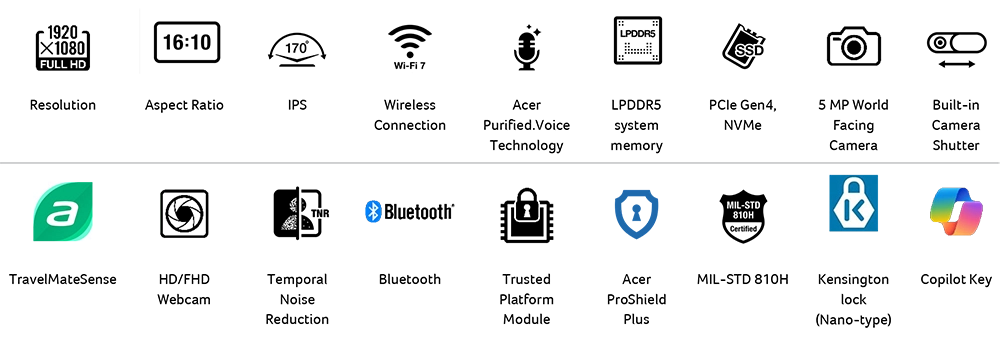Erleben Sie die Zukunft der Produktivität auf einem KI-fähigen Business-Notebook mit TravelMate Sense, PurifiedVoice mit KI-Geräuschunterdrückung, Microsoft Copilot mit Hotkey3 und mehr.