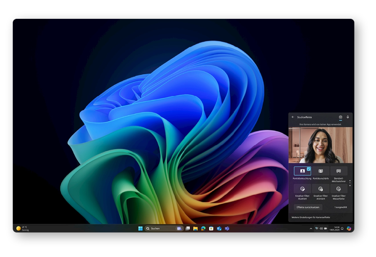 Mithilfe der KI-basierten Windows Studio-Effekte erleben Sie Videotelefonate und Online-Meetings in maximaler Qualität – unabhängig von der verwendeten App: KI blendet Hintergründe und Nebengeräusche aus, sorgt für permanenten Augenkontakt und stellt sicher, dass Sie stets optimal zu sehen und zu hören sind.