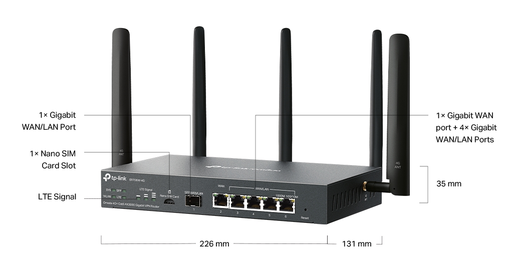 Der ER706W-4G Router bietet Ihnen eine herausragende Leistung und Sicherheit für Ihr Unternehmen oder Ihr Zuhause. Mit Unterstützung für 4G+ Verbindungen und dem leistungsstarken AX3000-WLAN-Standard bietet dieser Router blitzschnelle Geschwindigkeiten für Ihre Internetverbindung. Sie können auf eine zuverlässige und schnelle Netzwerkverbindung zugreifen, unabhängig von Ihrem Standort.
