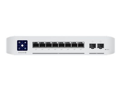 Der Switch Enterprise 8 PoE (USW Enterprise 8 PoE) ist ein vollständig verwalteter Layer 3 Switch mit (8) 2,5 GbE, 802.3at PoE+ RJ45-Ports und (2) 10G SFP+ Ports. Der USW Enterprise 8 PoE verfügt außerdem über einen 1,3" LCM-Farb-Touchscreen,