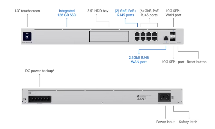 Die Dream Machine Special Edition (UDM SE) ist eine UniFi OS-Konsole der Enterprise-Klasse, die Heim- und Geschäftsanwender gleichermaßen bei der nahtlosen Skalierung und Verwaltung ihrer Netzwerke mit Hochgeschwindigkeits-Dual-WAN-Konnektivität (10G SFP+ und 2,5 GbE RJ45-Ports) unterstützt. Es ist auch eine zukunftssichere Konsole, da es alle kommenden UniFi OS-Anwendungen ausführen kann. Das UDM SE wurde für durchgängige Einfachheit entwickelt und verfügt über ein integriertes Bluetooth-Funkgerät, das den anfänglichen Einrichtungs- und Konfigurationsprozess optimiert, der mit der UniFI-Netzwerkanwendung (Web oder Mobil) in wenigen Minuten abgeschlossen werden kann.