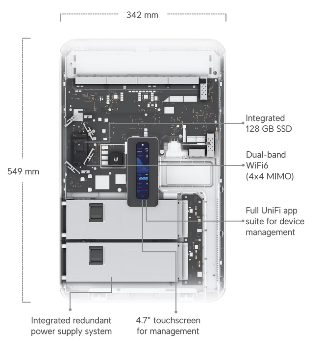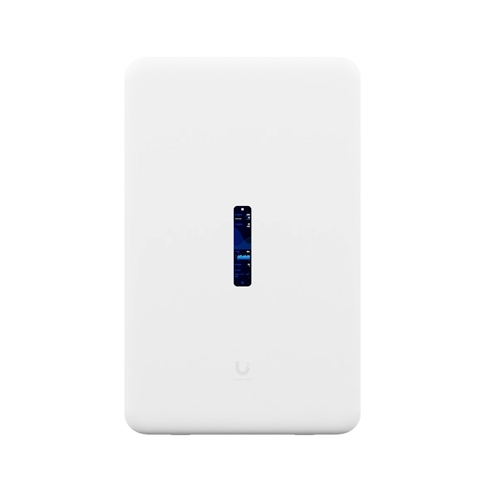 An der Wand montierbare UniFi-Gateway-Konsole mit integriertem Hochgeschwindigkeits-Zugangspunkt, Netzwerk-Videorecorder und PoE-Switch.