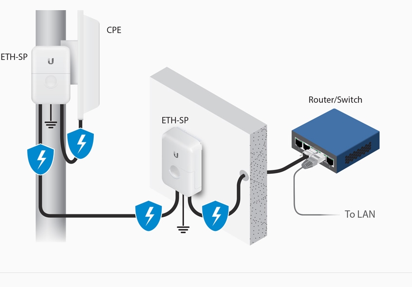 Alle Ubiquiti® airMAX®-Geräte haben bereits einen robusten ESD-Schutz eingebaut. Der ETH-SP-G2 bietet eine zusätzliche Schutzschicht für das Netzwerk. Der ETH-SP-G2 wurde entwickelt, um Power-over-Ethernet (PoE) oder Nicht-PoE-Geräte mit Verbindungsgeschwindigkeiten