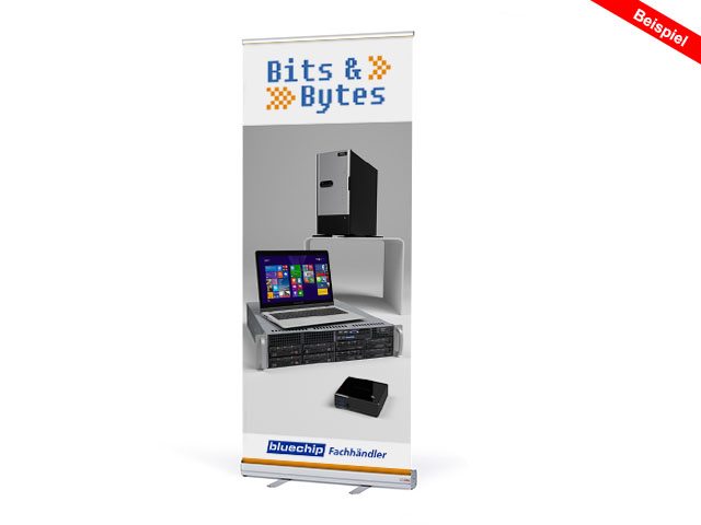 bluechip Rollupdisplay mit ihrem individuellen Co-Branding im Format 85 x 200 cm.