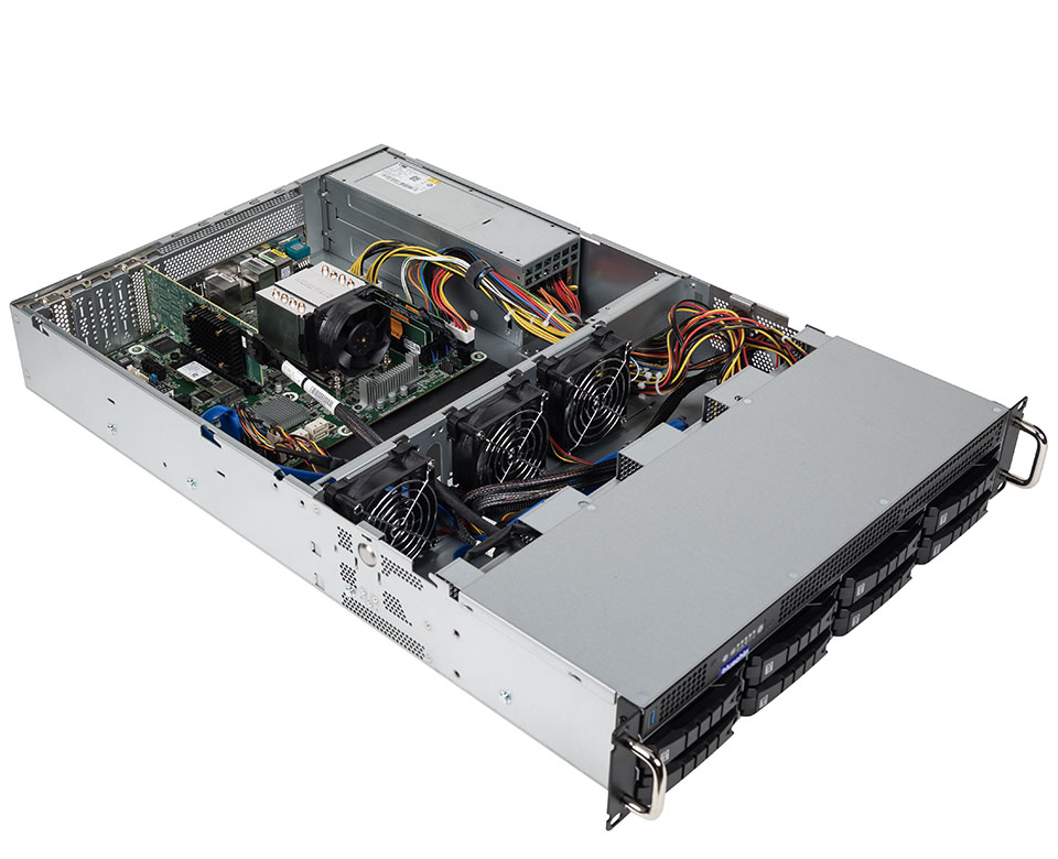 Das System bietet Platz für bis zu acht 2,5" oder 3,5" Speichermedien, die dank HotSwap-Unterstützung auch im laufenden Betrieb ausgetauscht werden können – ideal für maximale Verfügbarkeit und geringe Ausfallzeiten. Ein redundantes Netzteil mit 80Plus Platinum-Zertifizierung sorgt für höchste Energieeffizienz und zusätzliche Ausfallsicherheit.