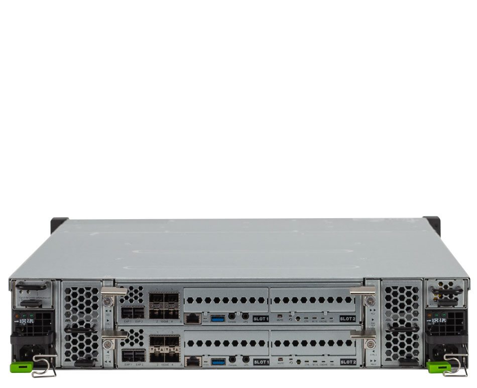 Jeder Controller verfügt über zwei Host-Steckplätze, die als iSCSI, Fibre Channel oder einer Kombination von beiden konfiguriert werden können, zusätzlich zu den integrierten 4-Port 10 GbE iSCSI (SFP+). Dadurch bietet die Storage eine hohe Flexibilität mit integrierten 8-Port 10 GbE iSCSI (SFP+) und bis zu 24 Host-Ports in einem Dual-Controller-System. Darüber hinaus bietet die STORAGEline R62209q enorme Skalierbarkeit durch die Verbindung von Erweiterungseinheiten mit bis zu 546 Festplatten oder 16,7 PB Rohkapazität für zukünftiges Datenwachstum.